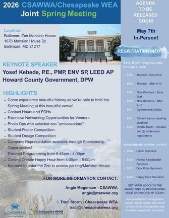 Celebrate Spring with friends and colleagues at the CSAWWA-Chesapeake WEA Joint Spring Meeting! We will be at the Mansion House at the Baltimore Zoo this year so make plans to get out of the office (home or other!) and join us at this year's Spring Meeting!
